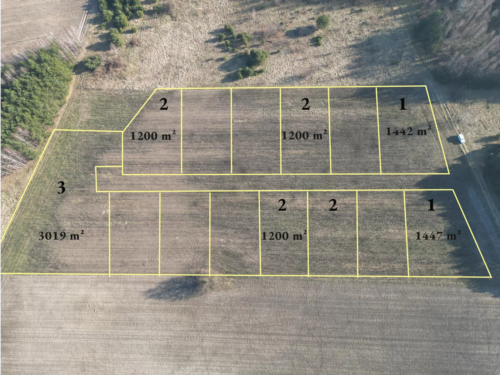 Działki przy drodze dojazdowej (1 na zdjęciu): 1442 m² oraz 1447 m²,