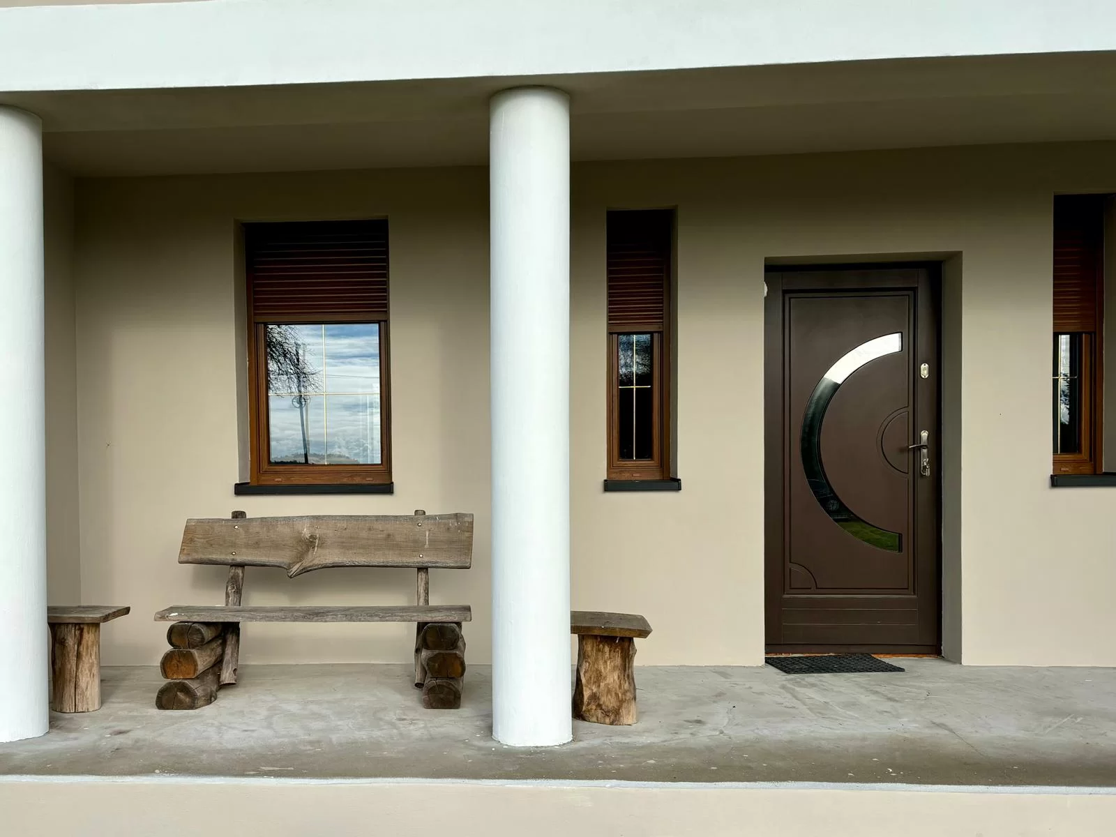 -Okna: Wewnętrznie białe, zewnętrznie w kolorze jasnego brązu/orzecha, wykonane z plastiku.