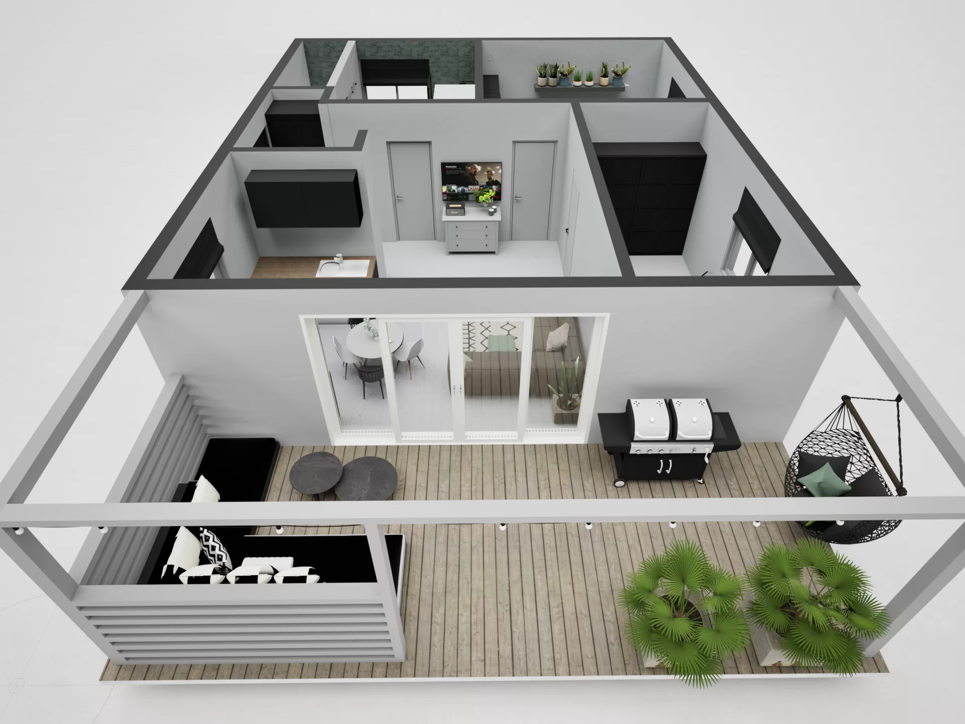 -dwa pokoje, salon z otwartą kuchnią, hol, łazienka i kotłownia,