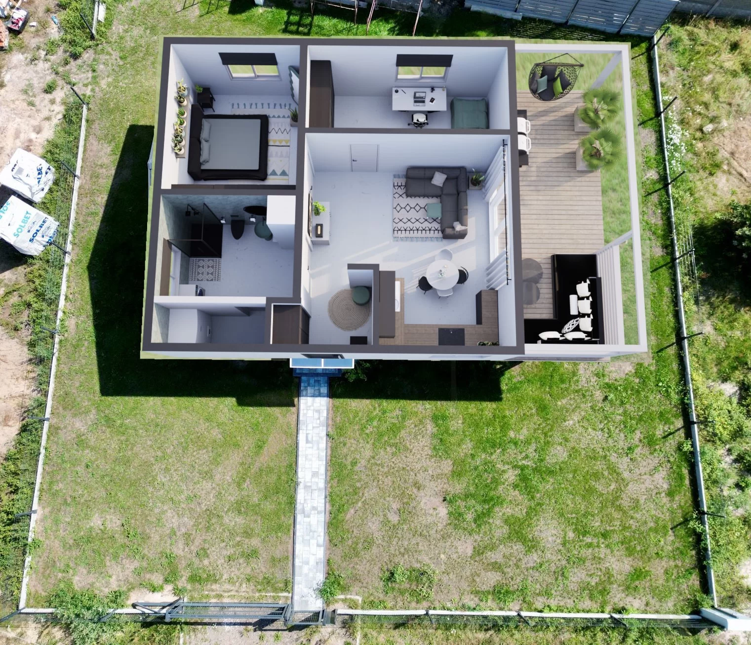 teren zostanie wyrównany, a wokół domu powstanie opaska z ozdobnego kamienia.