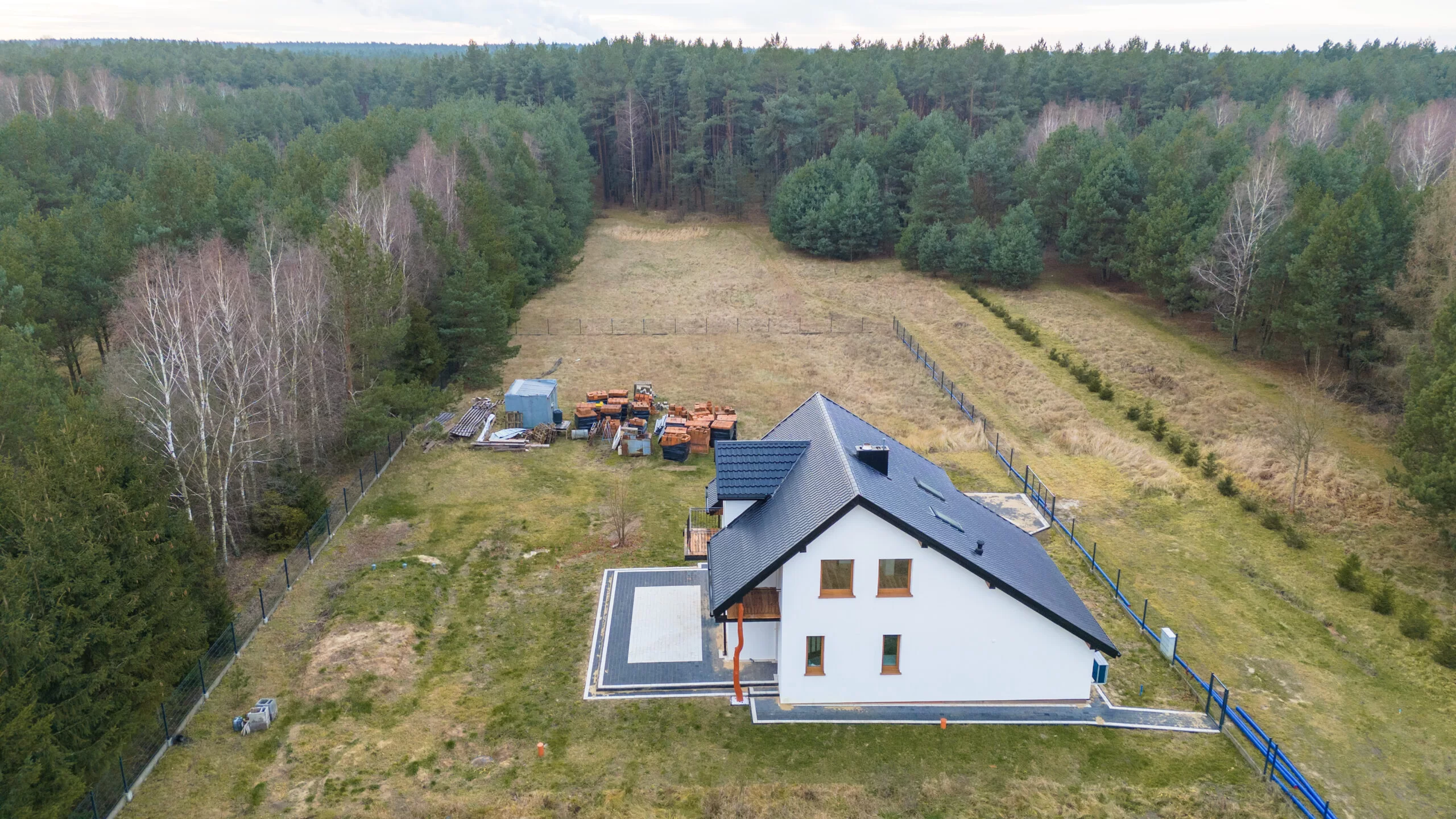 -Materiał budowlany: Wybudowany z pustaka max, ocieplony według najnowszych norm 20 cm styropian i poddasze 20 cm wełna.