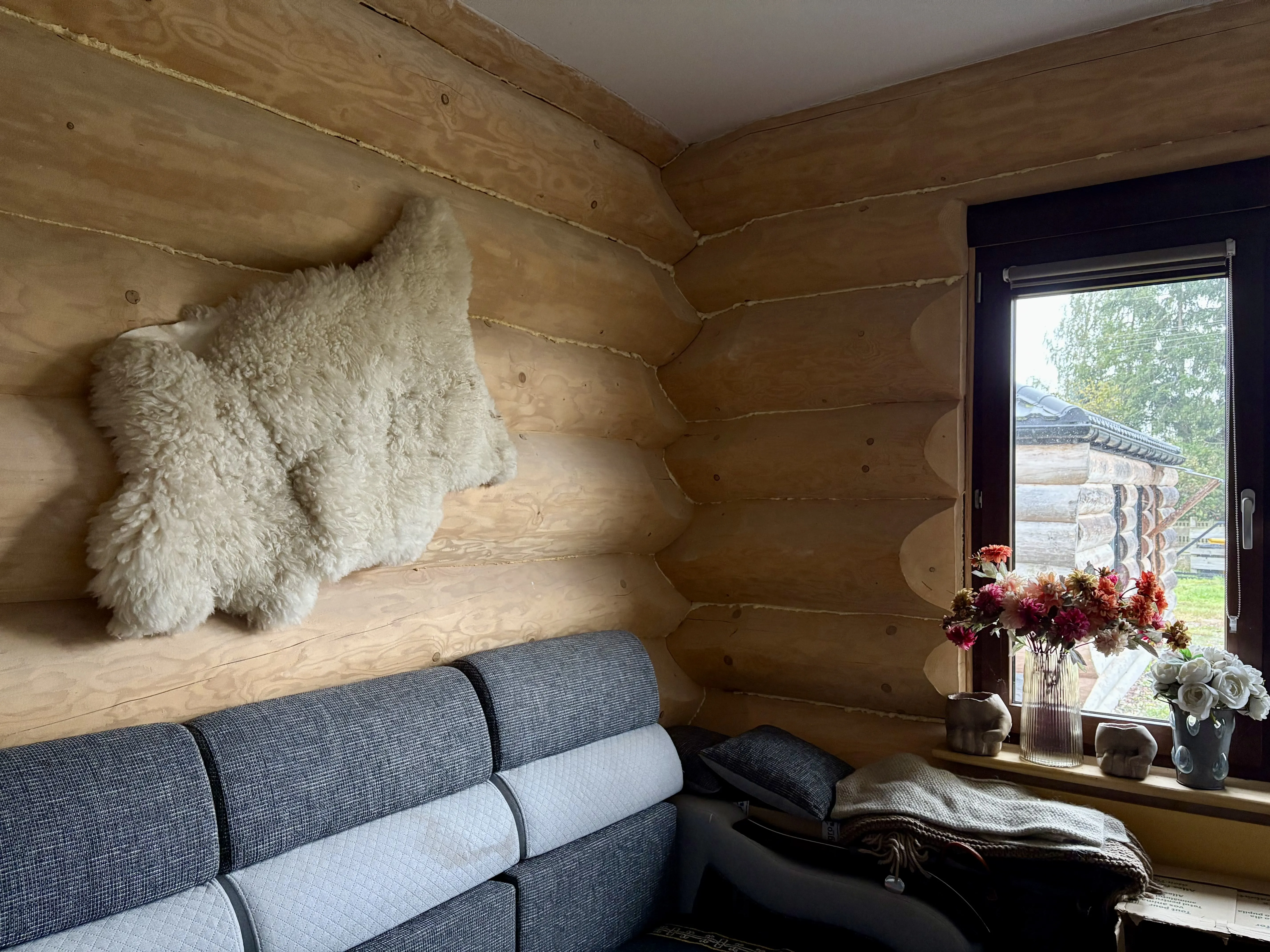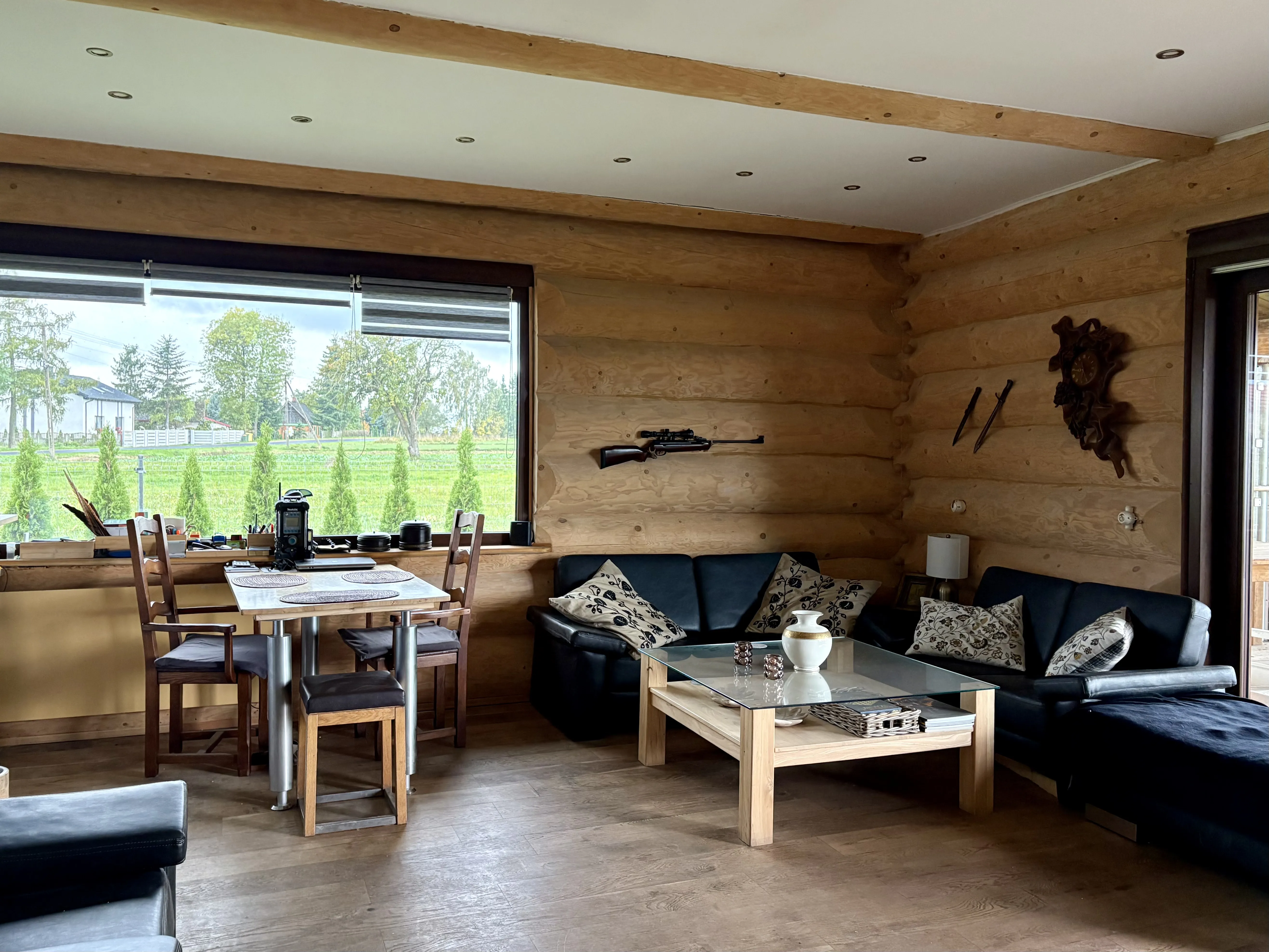 Na posesji znajduje się garaż o powierzchni 30 m², utrzymany w tej samej stylistyce z bali.
