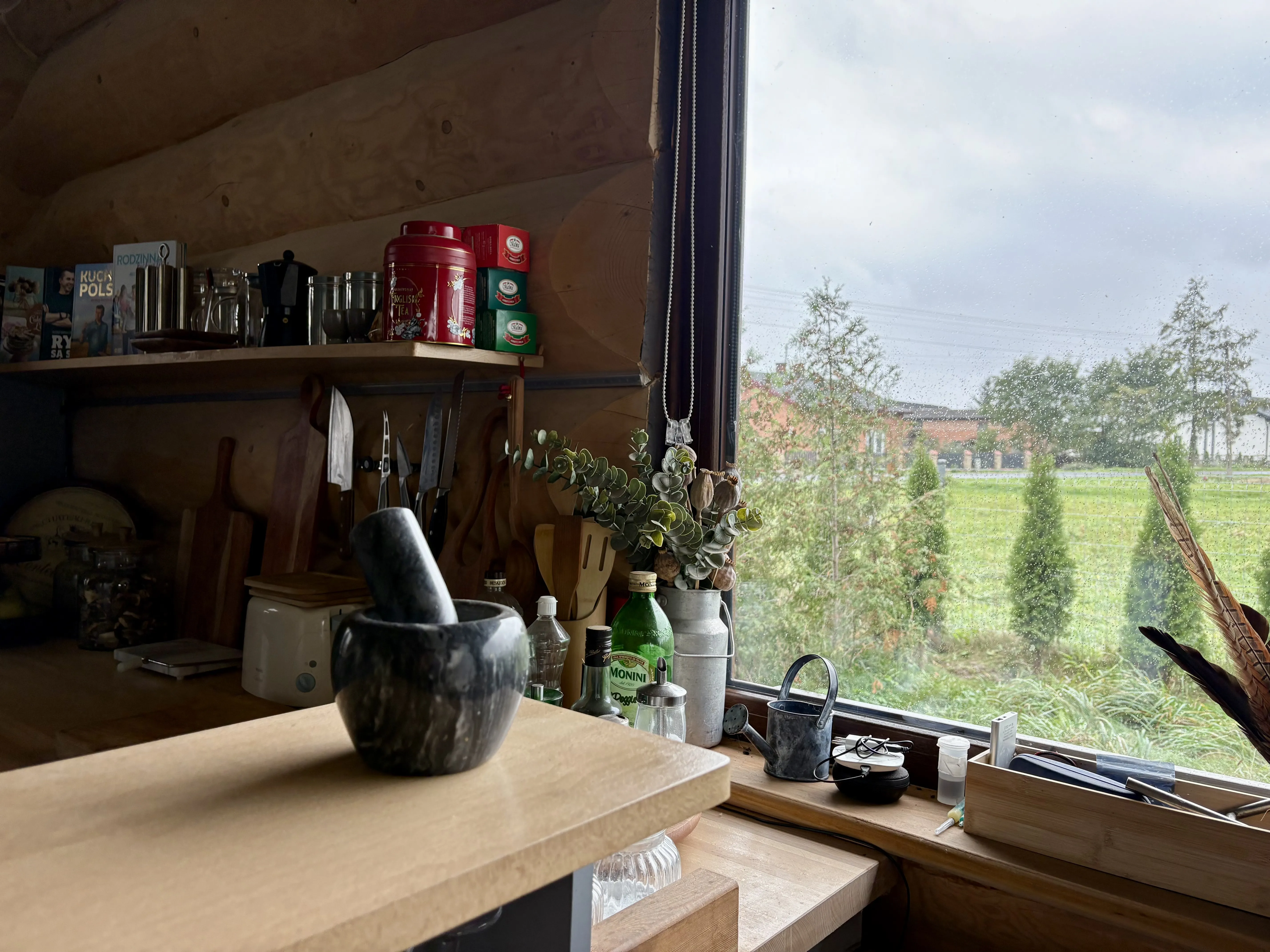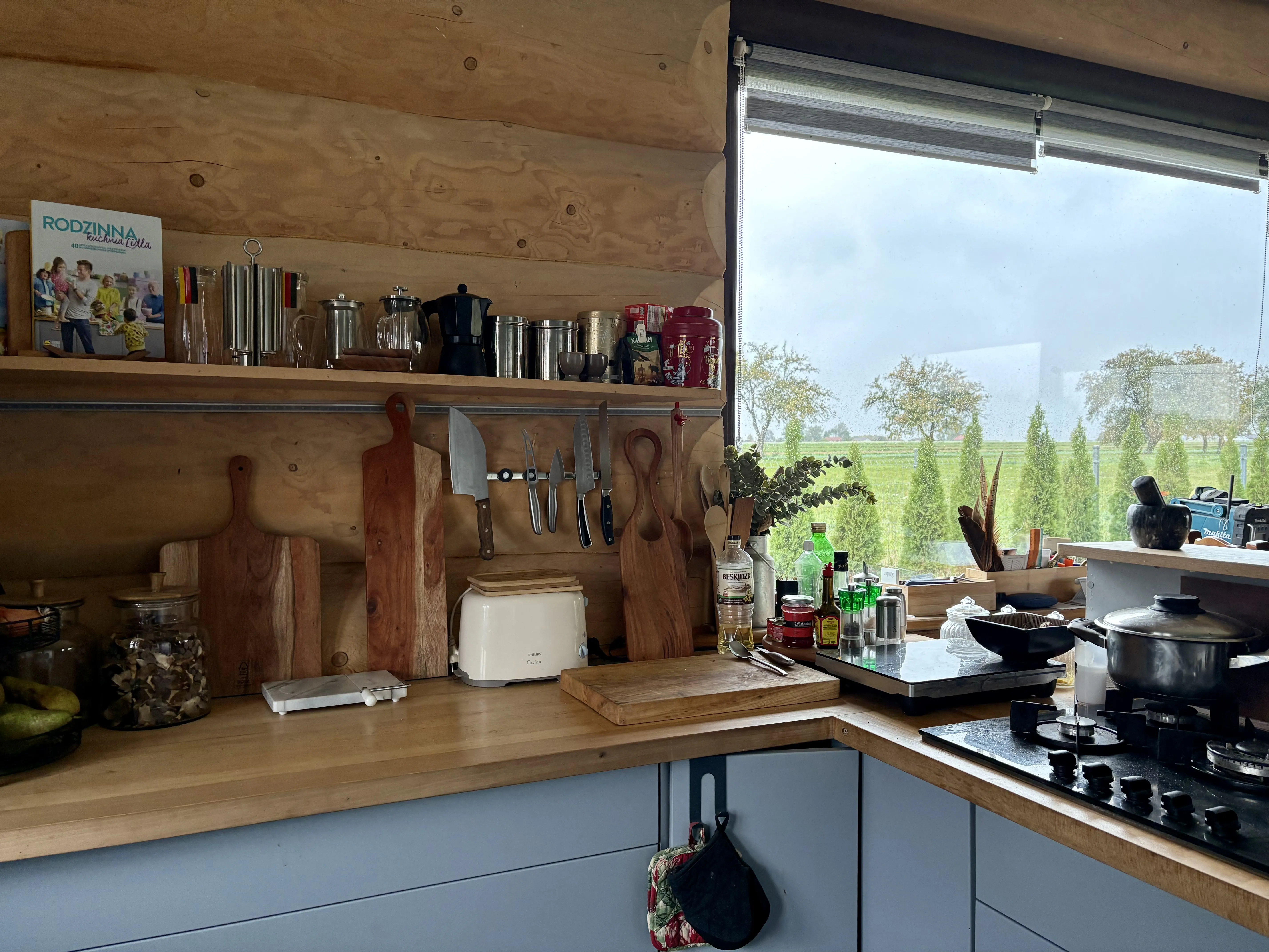 Kuchnia: meble na wymiar, szuflady z cichym domknięciem, drewniany blat, kuchenka gazowa sześciopalnikowa, miejsce na zmywarkę, dużą lodówkę w zabudowie, obszerna spiżarnia i piekarnik umieszczony ergonomicznie na wysokości blatu piersiowego.