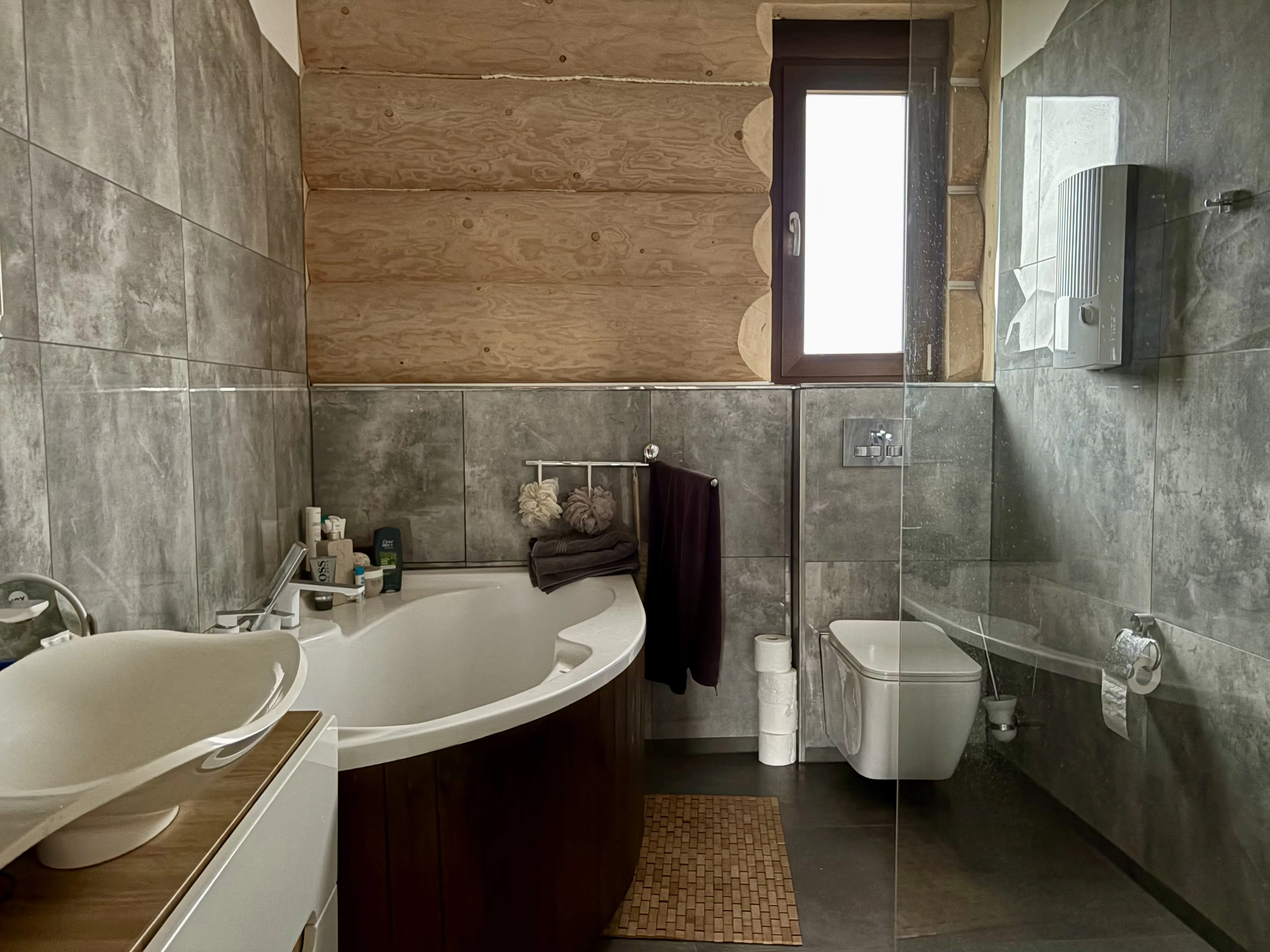 Łazienka: duża wanna, kabina prysznicowa z odpływem liniowym, nowoczesna armatura.