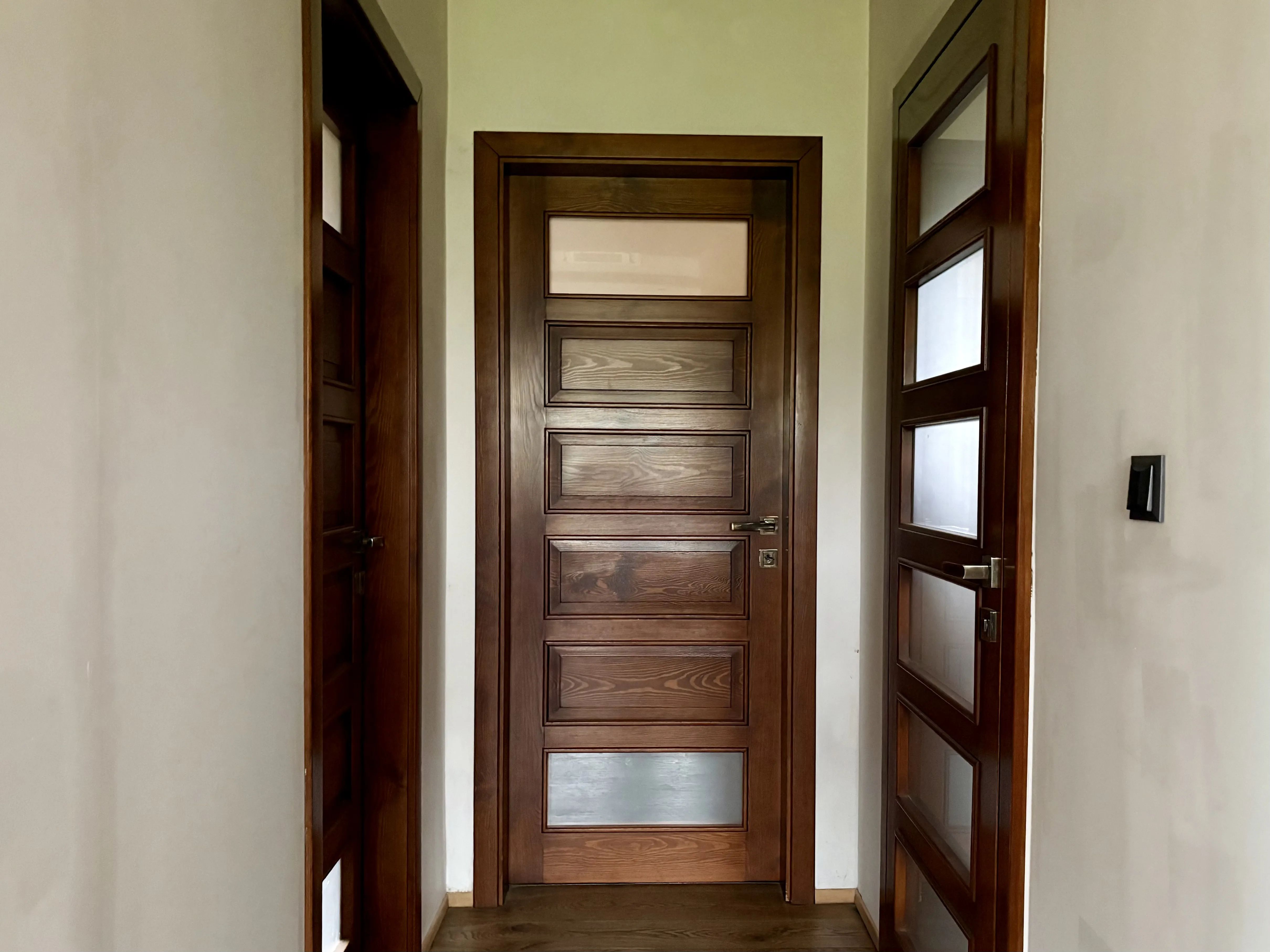 Podłogi: w pokojach i salonie deska barlinecka, w kuchni, łazience i komunikacji terakota – rozwiązanie eleganckie, trwałe i łatwe w utrzymaniu.
